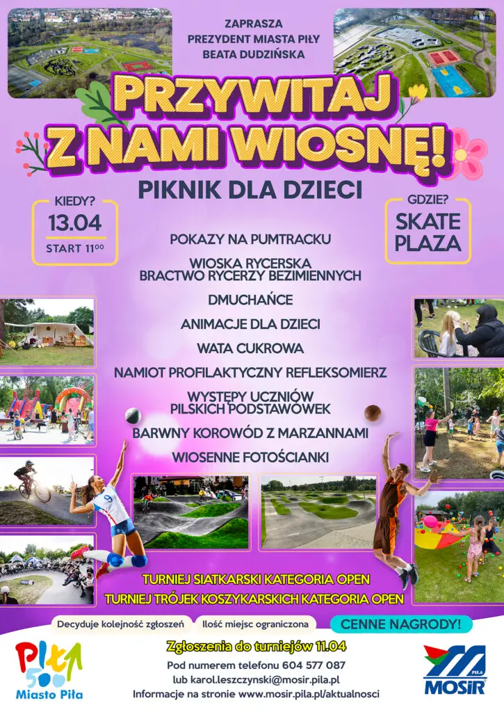 Moc Atrakcji Pilnik dla dzieci. Pokazy na Pumtracku. Rycerska wioska, Prezentacja Wozu Strażackiego OSP Piła, , symulator wypadków, rekleksomierz. Szczegóły na Plakacie oraz www.mosir.pila.pl/aktualnosci.